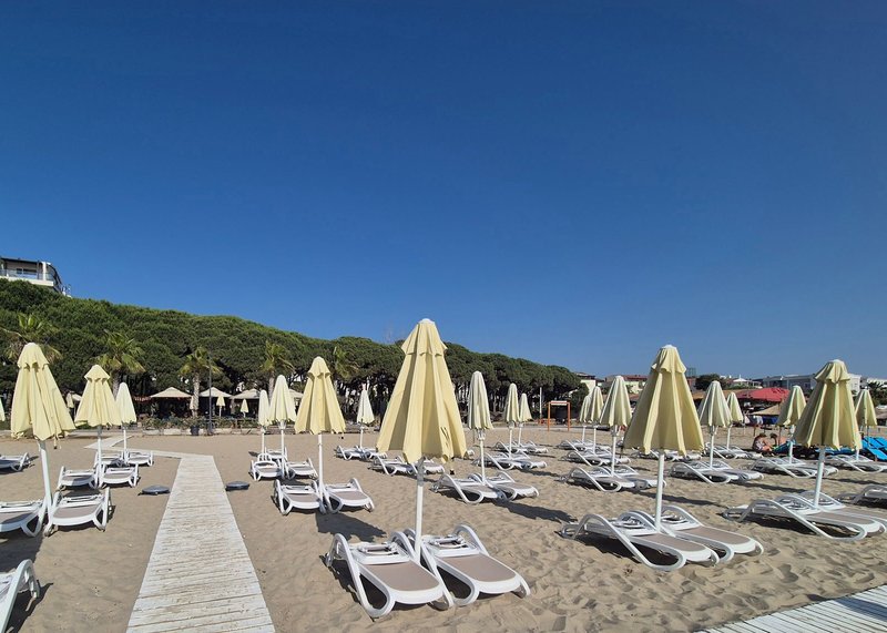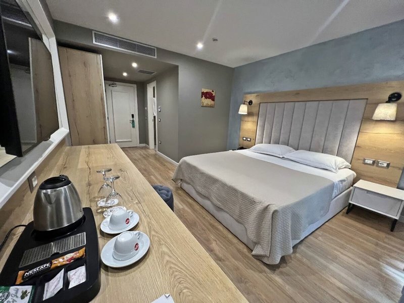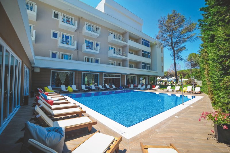 Ausstattung: Die moderne Hotelanlage ist von einem Pinienwald umgeben und verfügt über 106 Zimmer, in drei Gebäuden mit jeweils vier Etagen. In der Gartenanlage ist der Hauptpool mit integriertem Kinder-/Baby Pool, ein Ruhepool, Liegen, Sonnenschirme, Badetücher und die Beach Bar zu finden. Des Weiteren bietet das Hotel einen Lobbybereich mit Rezeption, eine Gemeinschaftslounge/TV Bereich, eine Lobbybar (8-23 Uhr geöffnet), ein Café, einen Souvenirshop, einen Arzt, einen Lift sowie Wi-Fi, welches in der gesamten Anlage inklusive ist. Ein Hauptrestaurant (Buffet) und ein À-la-carte-Restaurant (gegen Gebühr) sorgen für das leibliche Wohl. Parkmöglichkeiten sind nach Verfügbarkeit vorhanden.