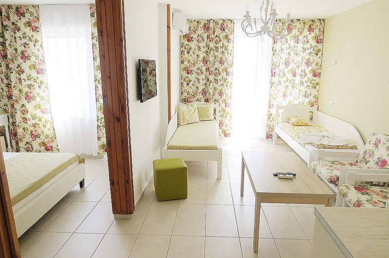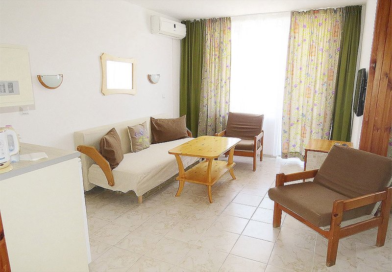 Štúdio bez kuchynky: Príjemne zariadené štúdiá bez kuchynky (cca 35 m²) môžu ubytovať až 4 osoby a majú manželskú posteľ, 2 ďalšie samostatné postele, sprchu/WC, chladničku, sušič vlasov, rýchlovarnú kanvicu, klimatizáciu, satelitnú TV, posedenie s rozkladacou pohovkou a zariadeným balkónom orientovaným do ulice.