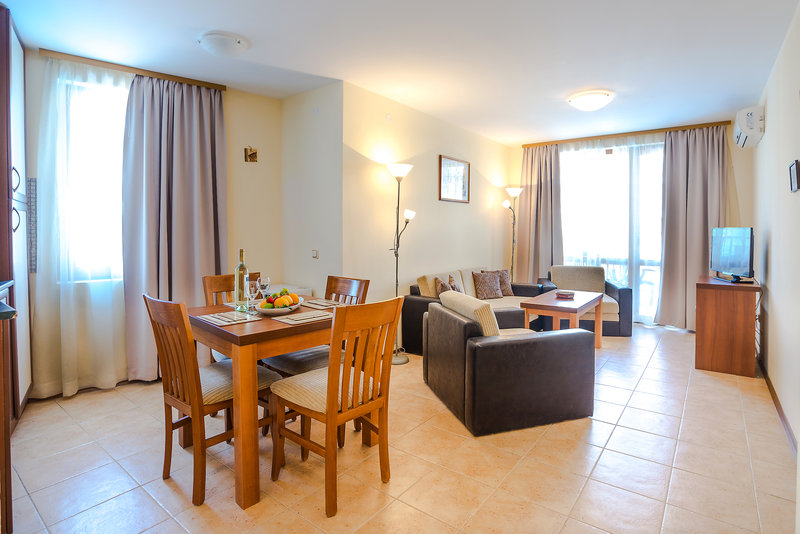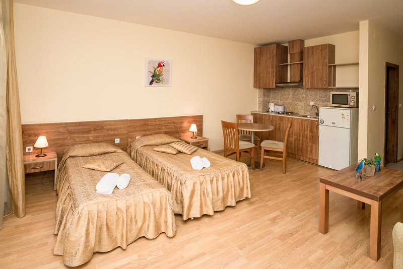Die Zimmer mit Wohnraum sind ausgestattet mit Twinbett oder Einzelbett, Babybett (geg. Gebühr), Laminat, Kitchenette, Kühlschrank, Wasserkocher (kostenlos), Balkon oder Terrasse, Privatpool, Gemeinschaftspool, Safe (geg. Gebühr) und Flatscreen-Sat-TV sowie individuell regulierbarer Klimaanlage. Badezimmer mit Dusche (Größe: 35 - 60 m²). Handtücher werden wöchentlich kostenlos gewechselt. Die Bettwäsche wird wöchentlich kostenlos gewechselt.