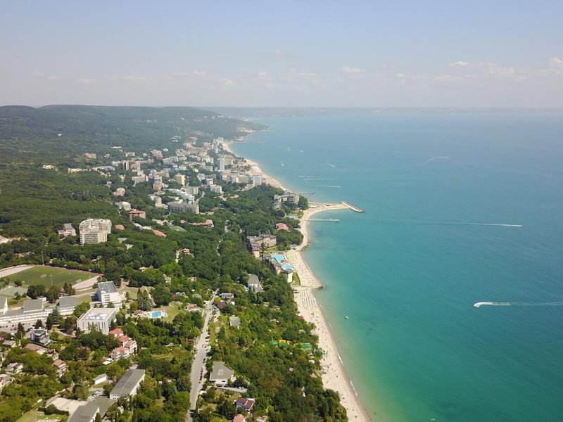 Lage & Umgebung Das Hotel befindet sich in malerischer Hanglage, am Ortsrand des Seebads Goldstrand. Der Strandabschnitt ist bereits nach wenigen Metern zu erreichen. Zum etwa 1,5 Kilometer entfernten Zentrum der Ortschaft verkehrt ein Shuttlebus. Zahlreiche Boutiquen, Bars und Restaurants sind auch in der unmittelbaren Nähe des Hotelgebäudes vorzufinden. Die Stadt Albena ist ca. 7 Kilometer und die Stadt Varna ungefähr 18 Kilometer vom Hotel entfernt.