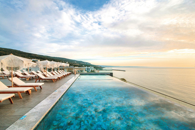 - Direkttransfer ab/bis Flughafen Varna, exklusiver Zugang zur Rooftop-Konzept-Zone mit Infinity-Pool und Sky-Bar und Restaurant (Langschläfer-Frühstück, Gourmet-Küche, abends mit Reservierung), Zugang zum separatem Strandbereich mit Service, Premium-Getränke-Angebot, Nutzung des Panorama-Fitnesstudios im GRIFID Encanto Beach (7 Gehminuten entfernt)
