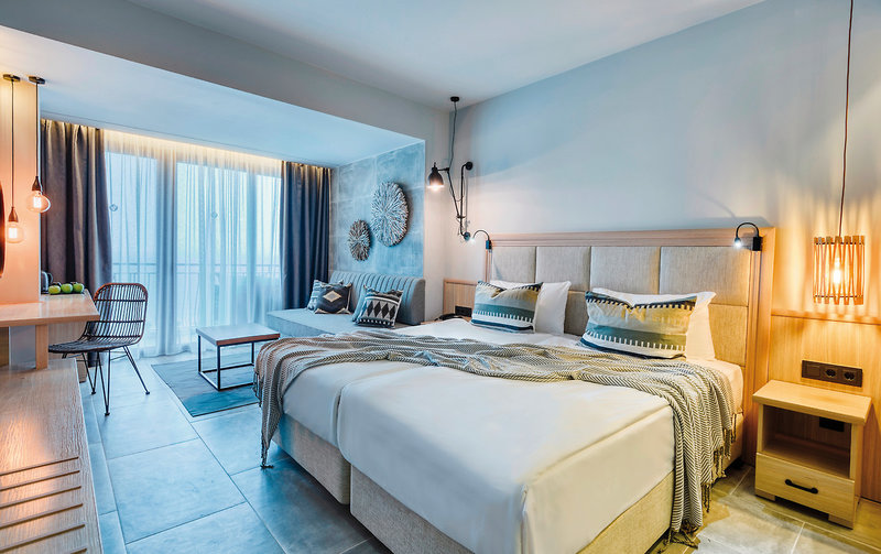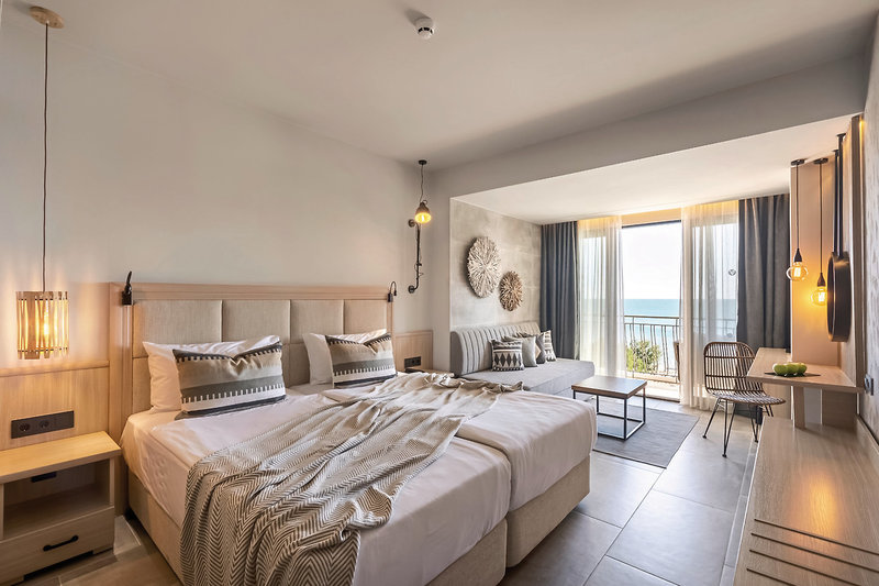 - 36-40 qm, Familien, Meerblick (seitlich), Nichtraucher, 1 separates Schlafzimmer, kombinierter Wohn-/Schlafraum, 2 Sofabetten, 1 französisches Bett, 1 Bad, Dusche, WC, Haartrockner, Kosmetikspiegel, Klimaanlage, Korridor/Flur, Minibar, Auffüllung regelmäßig, Softdrinks, Kaffee/Tee, Bier, Wasser, Safe, 1 TV (Sat-TV, deutschsprachiges Programm, landestypisches Programm, Flachbildschirm), WLAN, Wasserkocher, Kaffee/Tee, Balkon (möbliert), Kopfkissen-Menü