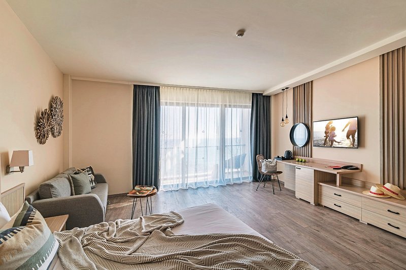 - 41-45 qm, Familien, Meerblick, Nichtraucher, 1 separates Schlafzimmer, kombinierter Wohn-/Schlafraum, 2 Sofabetten, 1 französisches Bett, 1 Bad, Dusche, Badewanne, WC, Haartrockner, Kosmetikspiegel, Laminatboden, Klimaanlage, Korridor/Flur, Minibar, Auffüllung regelmäßig, Softdrinks, Kaffee/Tee, Bier, Wasser, Safe, 1 TV (Sat-TV, deutschsprachiges Programm, landestypisches Programm, Flachbildschirm), WLAN, Wasserkocher, Kaffee/Tee, Balkon (möbliert), Kopfkissen-Menü