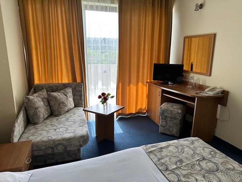 - Jednolôžková izba s manželskou posteľou (DSX1), dvojlôžková izba, nefajčiarska izba, minimálny vek v izbe: 2 roky, v hlavnej budove, výhľad na bazén, výhľad na mesto, cca 15 - 17 m², posledná čiastočná rekonštrukcia v roku 2014, celkový počet izieb v tomto type izby: 1, rozloženie: 1 spálňa, 2 samostatné postele, 1 rozkladacia pohovka, klimatizácia: zadarmo, podlaha: koberec, Internet: WLAN/WiFi: zadarmo, TV: káblová TV, upratovacia služba: denne, zdarma, sprcha, WC, balkón
