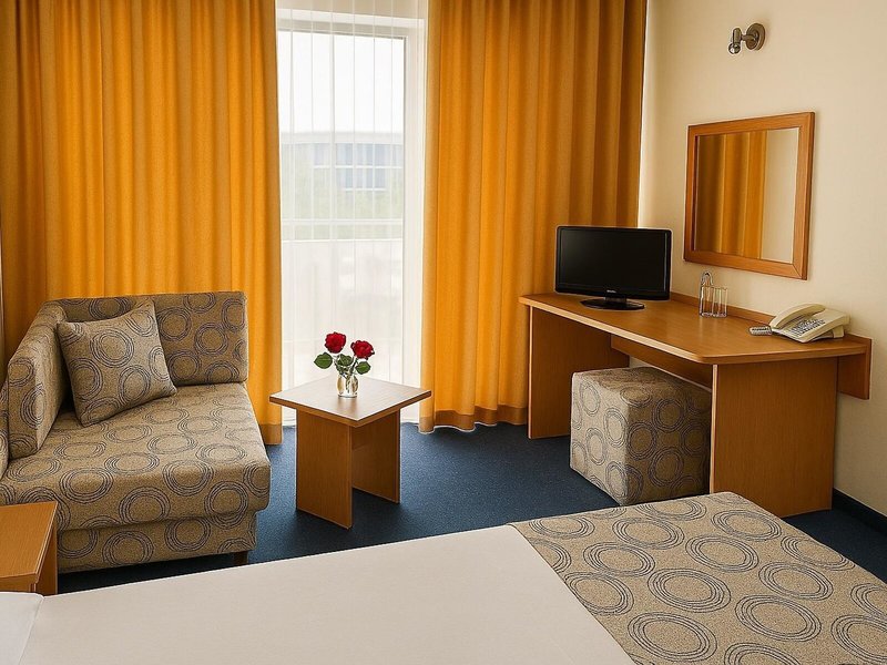 - Dvojlôžková izba Promotion (DZZ1), dvojlôžková izba, nefajčiarska izba, minimálny vek v izbe: 2 roky, v hlavnej budove, výhľad na mesto, cca 12 - 14 m², posledná čiastočná rekonštrukcia 2014, celkový počet izieb v tomto typ izby: 1, rozloženie nasledovne: 1 spálňa, 2 samostatné lôžka, 1 rozkladacia pohovka, klimatizácia: zdarma, studená, podlaha: dlažba, koberec, stojaci ventilátor, pohovka, písací stôl, telefón, Internet: WLAN/ WiFi: zadarmo, TV: káblová TV, upratovanie: denne, zadarmo, sprcha, WC, balkón